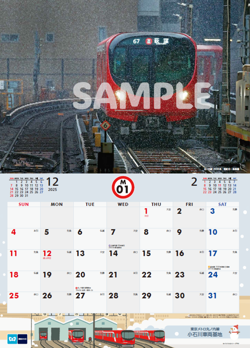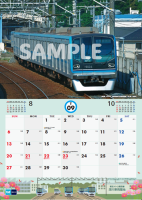 東京メトロの車両写真を全13ページ(表紙含む)掲載しています。 日玉の背景に、車両たちの帰る場所「車両基地」の風景と、月ごとに季節をイメージした絵本風のイラストをデザインしました。