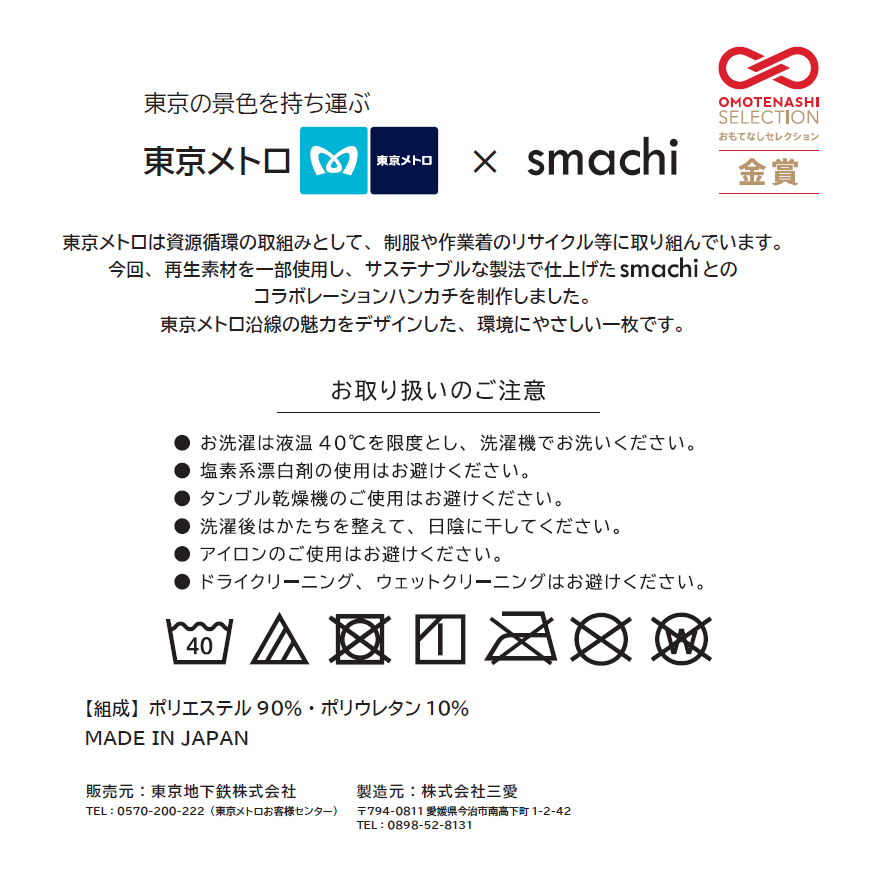 新商品発売のお知らせ【制服をリサイクルしてサステナブルに!東京メトロ街並みアートクロス 銀座・神谷町】 2026.4.16 銀座と神谷町の街並みと路線図×和柄をあしらった2種類のハンカチを発売します。 「OMOTENASHI Selection 2025 金賞」受賞のsmachi×東京メトロのコラボハンカチです。 東京メトロでは制服や作業着のリサイクルなど資源循環の取り組みを行っています。本商品は、使用済み制服類をリサイクルした再生ポリエステルを25%使用しています。 発売日:2026年4月24日(金)12時~ 次» お知らせ