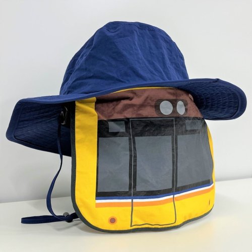 暑い夏の必需品、お子さま用の日よけ付きハットです。首の後ろ部分に銀座線をデザインした日よけをつけています。