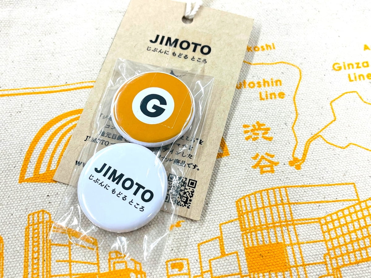 缶バッジは銀座線の路線記号とJIMOTOロゴデザインのものがそれぞれ1つ付いています。