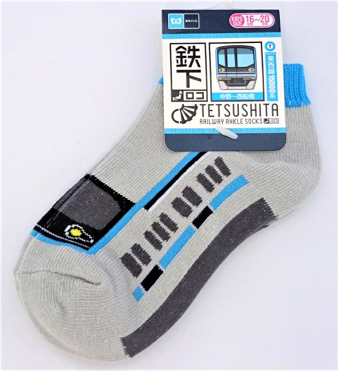 東西線の15000系がデザインされた、お子さま向けのくるぶしソックス「鉄下」です。
